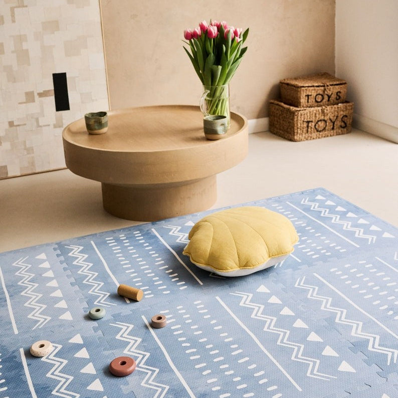 Create a safe and cozy play space for your baby with the OLYA KIDS “Boho” puzzle playmat. Made from soft, non-toxic EVA foam, its neutral, minimalist design adds warmth and style to any room and makes a perfect backdrop for baby photos.