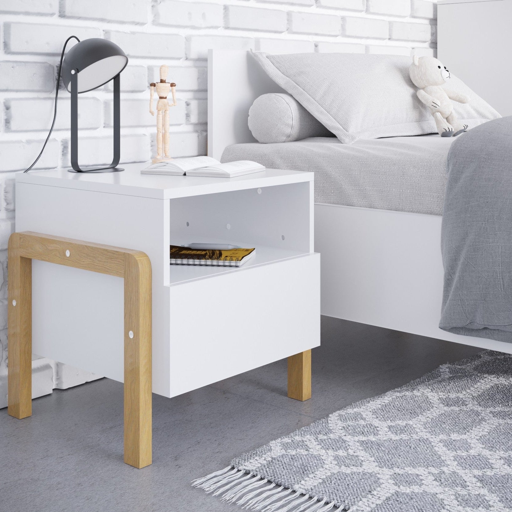 The Victor nightstand from Kocot Kids is a Scandinavian-inspired piece that combines natural oak with crisp white finishes. Designed for children's rooms, it offers practical storage with a clean aesthetic.