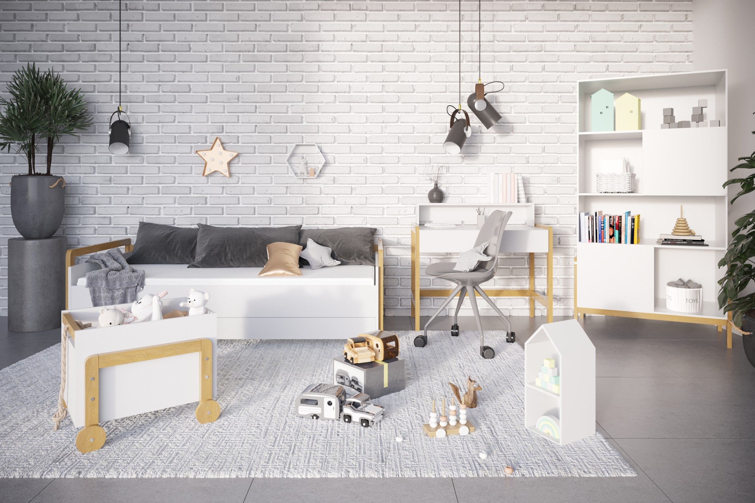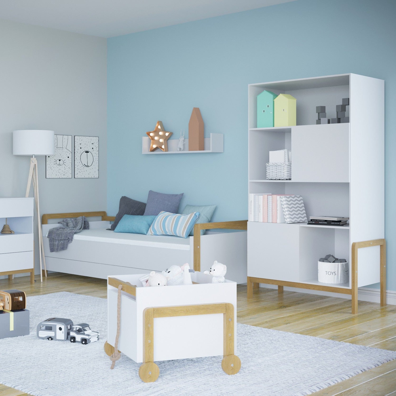 The Victor bookshelf from Kocot Kids blends Scandinavian design with practical storage solutions. Made in Poland, it features a combination of white laminated chipboard and solid oak elements, offering both durability and a clean aesthetic.