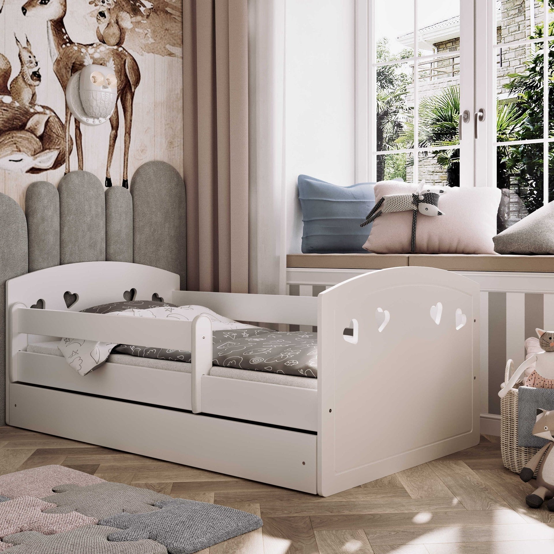 The Julia bed combines a light, charming look with practical design. Heart-shaped cutouts, rounded edges, and solid materials make it a perfect fit for a cozy and safe child’s room. Built to last and easy to love.