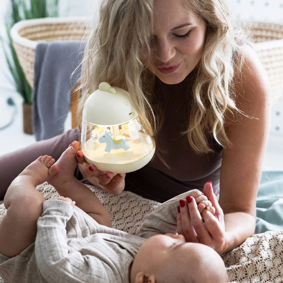 Nattlampan med karusell och speldosa ger rogivande sällskap både dag och natt. Snurrande hästar och speldosaens delikata melodi kommer att lugna ditt barn och skapa en avkopplande stämning.